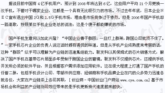 一款熱銷的洋品牌手機出現不到三個月,相似外觀和同樣功能的國產手機就以更低廉的價格迅速席卷市場。一位經銷商說:“這樣的手機比洋品牌要低上幾百甚至上千元,如果洋品牌一臺機器賺上千元的話,國產手機企業覺得只需要賺幾百元就夠了!痹诔啥继下返囊患沂謾C賣場里,大多數產品都是國產品牌,當你咨詢某個洋品牌的時候,導購員會賣力地推薦你去購買性價比更好的某款功能外觀相近的國產手機。[創業網-中國創業門戶網站www.390056.com]在這里,國產手機是紅花,而洋品牌成了地道的綠葉。
