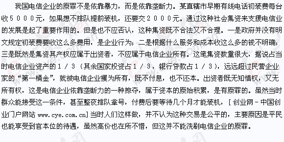 我指出電信企業有原罪,決不是有意來貶低電信行業,而是在市場經濟條件下,在法治社會,應該如何對待自己的壟斷地位。有人可能說,電信企業這些做法,都是得到政府允許的,不能算作原罪。但政府的允許不等于是合理的。馬克思揭露英國的資本原始積累,所有圈地運動,都有國會的立法,而這種做法卻遭到社會正義的譴責。馬克思說:“而對他們的這種剝奪的歷史是用血和火的文字載入人類的編年的。”(同上,783頁)前幾年有一件案例,大家可能還記憶猶新,一個壟斷部門被告上法庭:即一個律師狀告鐵道部春節火車票漲價是非法的,違背了市場原則。鐵道部說,漲價為了使客運高峰分流。那么人們首先要問:為什么不采取降價把客流吸引到客運低谷;二是漲價憑什么,一沒有提高服務質量,一個一百多個座位的車箱擠了二百人,水泄不通,服務質量下降了;[創業網-中國創業門戶網站www.390056.com]二是沒有增加成本,在不提價的情況下就可以增加一倍收入;三是春節客運很大一部分是農民工,他們辛辛苦苦一年掙點錢,歡歡喜喜回家過年,鐵道部門利用春節火車票漲價,從他們口袋掏錢,這是趁火打劫,是敲竹杠。