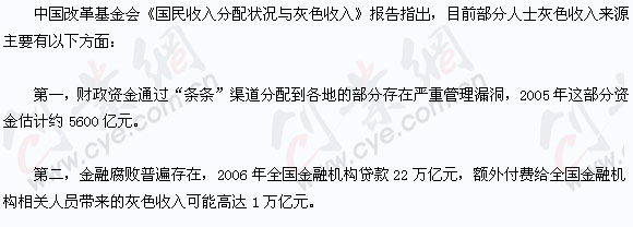 目前城鎮最高與最低收入10%家庭間的人均收入差距約31倍,而不是統計顯示的9倍。城鄉合計,全國最高與最低收入10%家庭間的人均收入差距約55倍,而不是按統計數據推算的21倍。中國實際收入差距要遠大于統計顯示的水平。目前收入分配差距過大的原因,主要不在于市場化,而在于制度不健全所導致的腐敗和灰色收入。這里將非法收入、違規違紀收入、按照社會公認的道德觀念其合理性值得質疑的收入,及其他來源不明的收入,統稱為灰色收入。