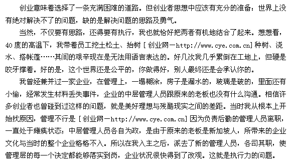 創(chuàng)業(yè)者其實只需要把握住一個道理:市場需要我們怎樣做我們怎樣做就行了。把一件件小的事情做好了,整個問題也就解決了。做企業(yè)就像解繩子,只要有耐心,順著繩子的規(guī)律,一團(tuán)亂麻理清后,不知不覺地你也就成功了。當(dāng)然,我只是用一個通俗的道理來說明問題,做企業(yè)并不是想像的那么復(fù)雜。關(guān)鍵是需要找準(zhǔn)門道,摸清規(guī)律。每一個創(chuàng)業(yè)者在創(chuàng)業(yè)之初都會構(gòu)畫一幅美好的藍(lán)圖,但最后實現(xiàn)的有多少人呢?在企業(yè)管理上,好的思路如果無法得到很好的執(zhí)行,那將是很大的敗筆。