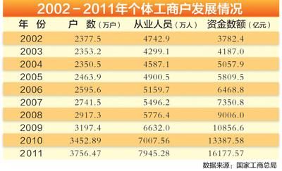 第四階段:2005年至2011年,穩定發展階段,年均增長7.3%。經過幾年調整,自2005年起,個體工商戶數量下降的狀況得到改變,出現正增長,個體工商戶從2005年底的2463.9萬戶、從業人員4900.5萬人、注冊資本金5809.5億元,發展到2011年的3756.47萬戶、資金1.62萬億元、從業人員7945.28萬人。