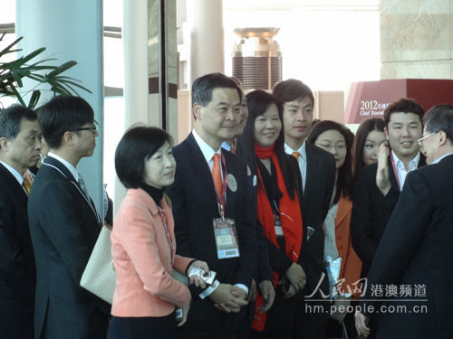 2012年3月25日,行政長官候選人梁振英(左四)在投票現場。 (人民網記者葛瑜瑋攝)