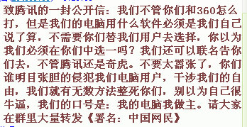 就在360和騰訊的爭(zhēng)斗不斷升級(jí)之際,在或支持360或支持騰訊的聲音之外,出現(xiàn)了另外一種來(lái)自“中國(guó)網(wǎng)民”的聲音,聲稱(chēng)二者的爭(zhēng)斗是在明目張膽地侵犯用戶(hù)的電腦,以下是在騰訊的QQ群里廣為轉(zhuǎn)發(fā)的“致騰訊和360的‘公開(kāi)信’”: