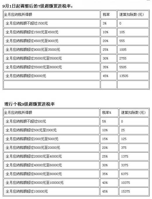 從今年9月1日起,修改后的個稅法將正式實施,個稅起征點將從現行的2000元提高到3500元,稅率由九級改為七級,為3%至45%。(稅率如文末所示)